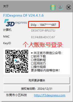 如果是购买的是个人版加密狗,右上角的登录人像与下方的购买模块和授权时间会隐藏。账号名称会改为英文。